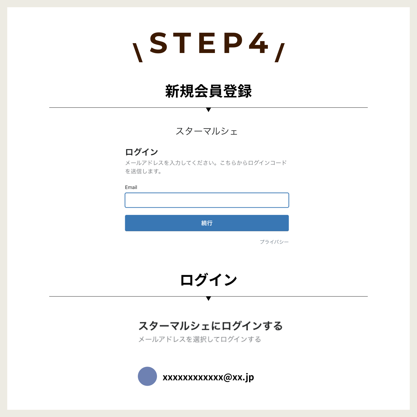 スターマルシェを初めてご利用の場合は、メールアドレスを入力し、会員登録を行います。ここでの会員登録はメールアドレスの入力→受信メールでログインコードを確認→ログインコード入力と、最短2分程度で完了します。なお、既に会員登録済みのお客様は「ログイン画面」からいつでもログインできます。