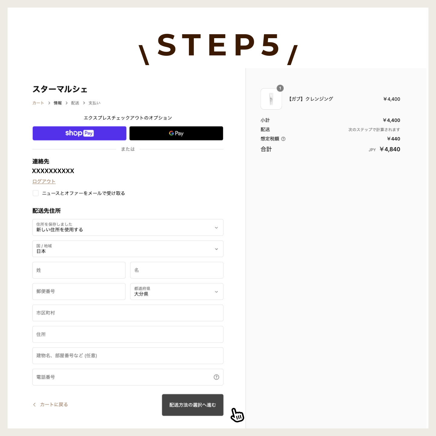 配送先住所などを入力します。すでに以前にスターマルシェで買い物をされている方は、過去に利用した登録済み情報が表示されますので再登録は不要です。